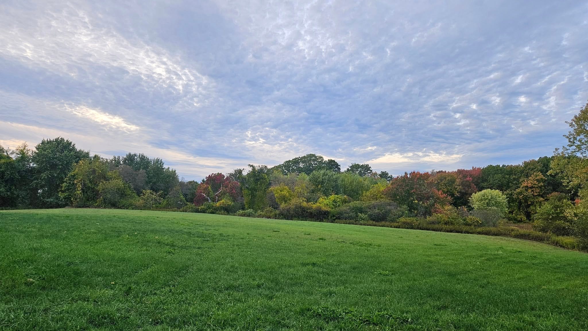 The leaves on the trees were just beginning to change to their fall colors but the grass was so green and quite plush. In fact, it was the sky that day that drew me into the field.